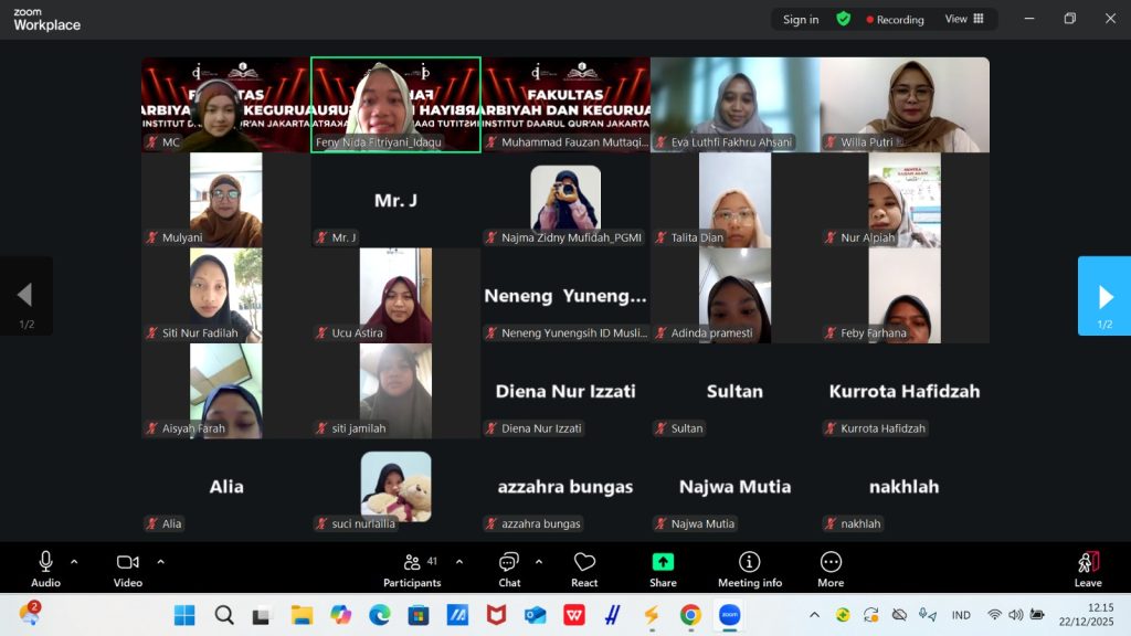 Kuliah tamu kali ini menghadirkan dua pemateri utama yang kompeten di bidangnya yaitu Eva Luthfi Fakhru Ahsani, M.Pd dari UIN Sunan Kudus. dan Willa Putri, M.Pd dari Institut Ummul Quro Al-Islami (IUQI) Bogor. Acara dibuka dengan sambutan dari Kaprodi PGMI Institut Daarul Qur’an, kemudian dilanjutkan sambutan hangat dari Dekan FTK Institut Daarul Qur’an, Muhammad Fauzan Muttaqin, M.Pd yang sekaligus membuka acara kuliah tamu Prodi PGMI, dan juga dipandu oleh Feny Nida Fitriyani, M.Pd selaku moderator dalam acara ini.